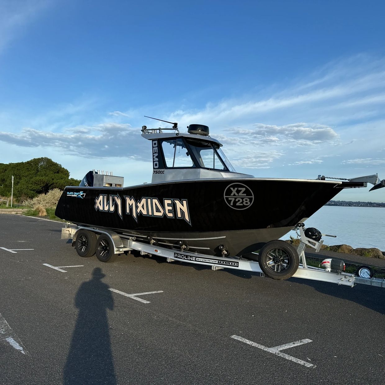 Our current demo boat is a 7.5m centre cab model with a deep v and variable deadrise for a soft ride and a huge flooding keel for stability at rest.